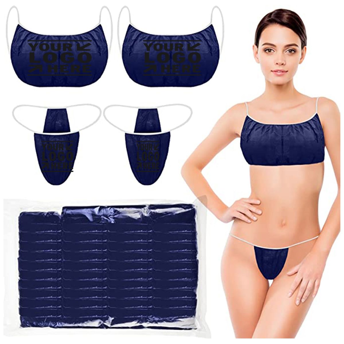 The disposable bra and underwear are made of non-woven fabric. The bra is stretchy, and adjustable in size, suitable for most people. The thong with a universal size is suitable for most women